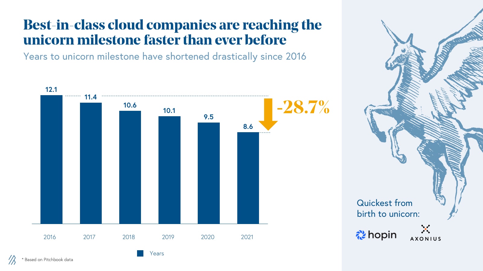 This can be observed in the data. Best-in-class cloud companies are reaching the unicorn milestone faster than ever before. When we look at the 2021 basket, it took the average Cloud 100 Honoree 8.6 years from founding to become a unicorn, as compared to 12.1 years in 2016. The two companies that were fastest to achieve the unicorn milestone on this year’s list were Hopin and Axonius, which have both experienced explosive growth at record-breaking speed. Founded in 2019, Hopin reached unicorn status by the end of 2020, propelled by unprecedented demand for its event technology platform. Axonious was not far behind — founded in 2017 with Bessemer leading its Series A in 2019, the cybersecurity leader entered the unicorn herd in early 2021.