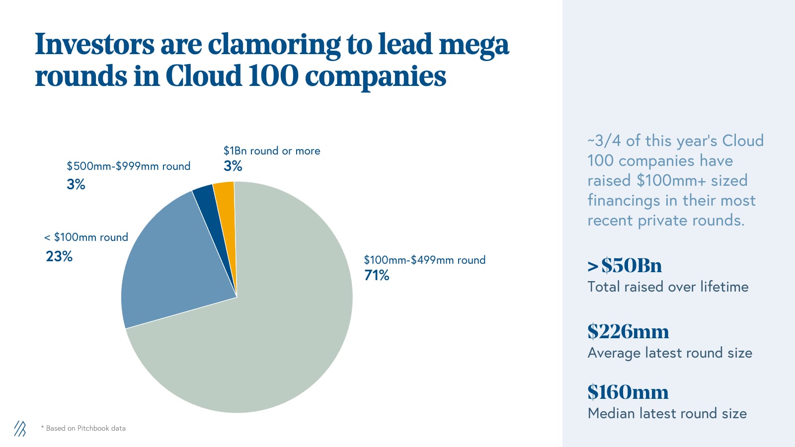 - The average Cloud 100 company exit value is nearly $3 billion, delivering powerful returns across both IPOs and M&A. Of the Cloud 100 exits, approximately 70% of them have exited for $1 billion or more, with additional value accretion in the public markets.
