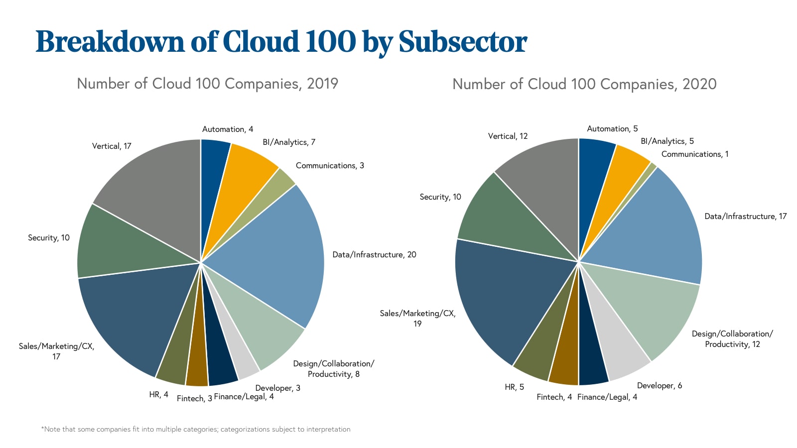 With 19 companies, the Sales/Marketing/CX category was the largest category represented on the 2020 Cloud 100 list, including such notable names as Intercom, Pipedrive, and Yotpo. This category grew by two net new companies year-over-year.
