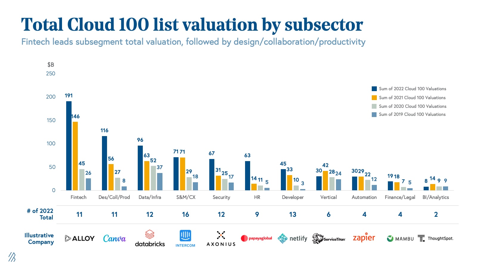 - AI dominates this year’s list, comprising $464 billion (42% of total value, doubling its list value percentage from last year) despite making up its category with just 22 companies. Fintech is a close second at $184 billion. The Cloud 100 spans ten sectors, including AI, infrastructure, fintech, design/productivity, sales/marketing/CX, security, HR, developer, vertical software, and others.