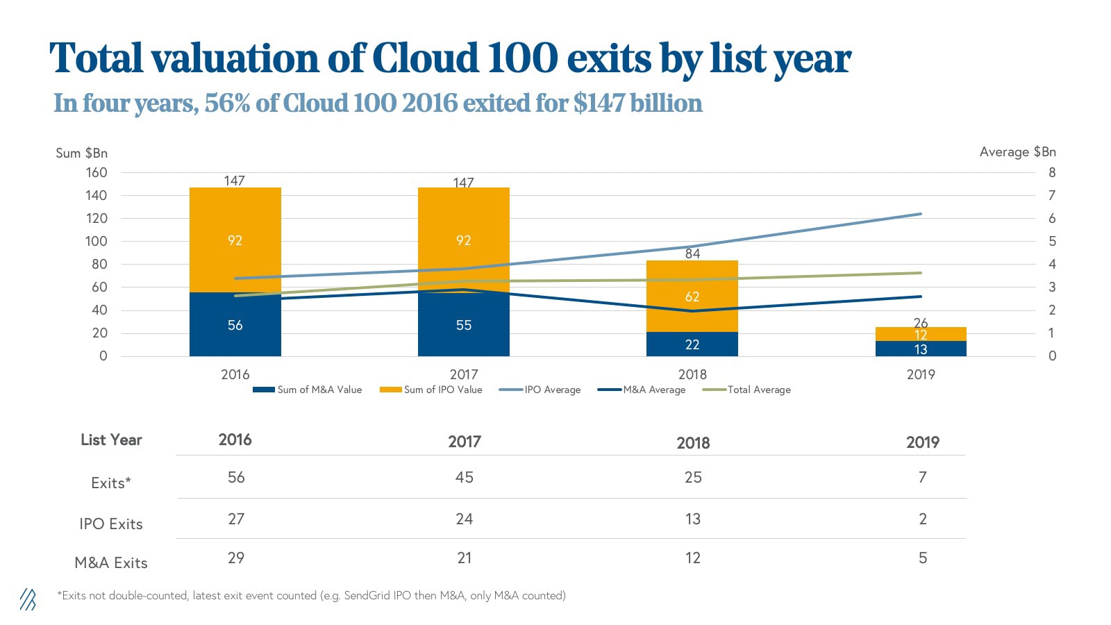In only four years, 56% of the 2016 Cloud 100 list has exited for a combined $147 billion of value, half via IPO and half via M&A. Forty-five percent of the 2017 Cloud 100 list, and 25% and 7% of 2018 and 2019 lists, respectively, have exited.