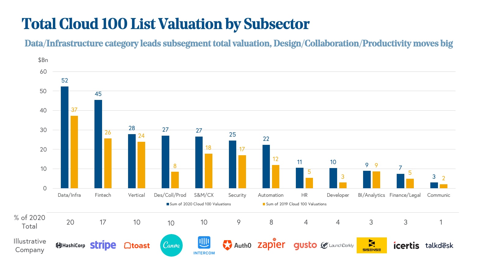 The data changes when looking at aggregate valuation by subsector. The Data/Infrastructure category represents 20% of the total value of the 2020 Cloud 100 list, the most of any category with $52 billion of equity value. The Fintech category is second with a total value of $45 billion, though $36 billion of that is taken by Stripe alone. Without Stripe, Fintech would drop from second place to the ninth most valuable category. Vertical software rounds out the top three with $28 billion of aggregate value, the largest of which is the top-10 company Procore at $5Bn of equity value.