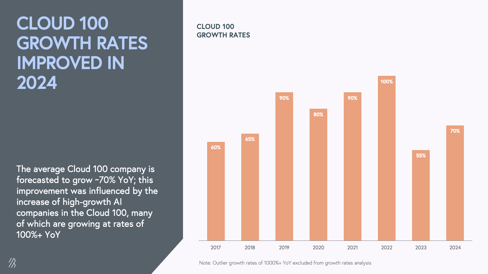 So, what’s enabling this hypergrowth? Beyond broad-based consumer demand for AI products and services, enterprises are increasingly demanding AI solutions to enhance efficiency, drive innovation, and maintain a competitive edge. AI companies are leveraging strategic partnerships with cloud providers to accelerate their reach, providing access to vast computational resources and cloud infrastructure. This hypergrowth is occurring at all layers of the new AI technology stack, from infrastructure to applications, across both B2B and B2C segments, as they redefine how we interact with software. The success of AI companies in bending the scaling curve has also influenced average Cloud 100 growth rates. The average Cloud 100 revenue growth rate fell to a record low of 55% year-over-year in 2023; however, this has rebounded incredibly to 70% for the 2024 cohort.