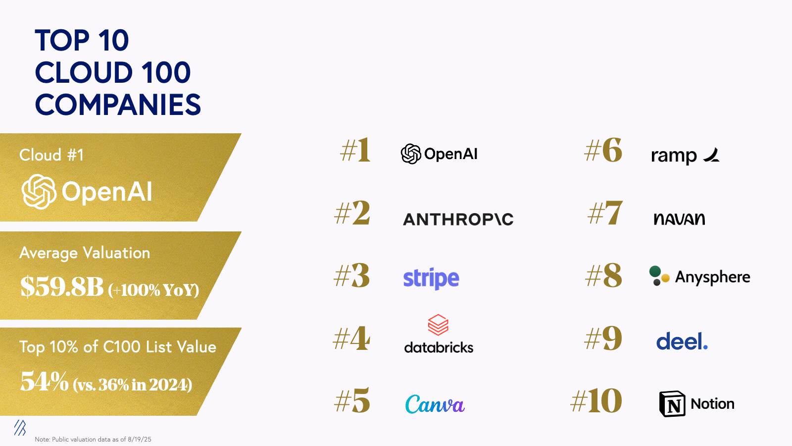 - The 2025 Cloud 100 achieved a record $1,117 billion in aggregate value, representing a 36% increase from $820 billion in 2024. The top 10 companies now account for $598 billion — 54% of list value, versus 36% last year — with OpenAI valued at $300 billion and exceeding the combined value of last year’s top 10 alone. These valuations continue to climb. Note: OpenAI was recently valued at $500 billion based on a recent secondary share sale transaction, Anthropic was recently valued at $183 billion after completing a $13 billion Series F, and Databricks is reportedly being valued at >$100 billion in a new, announced Series K financing.