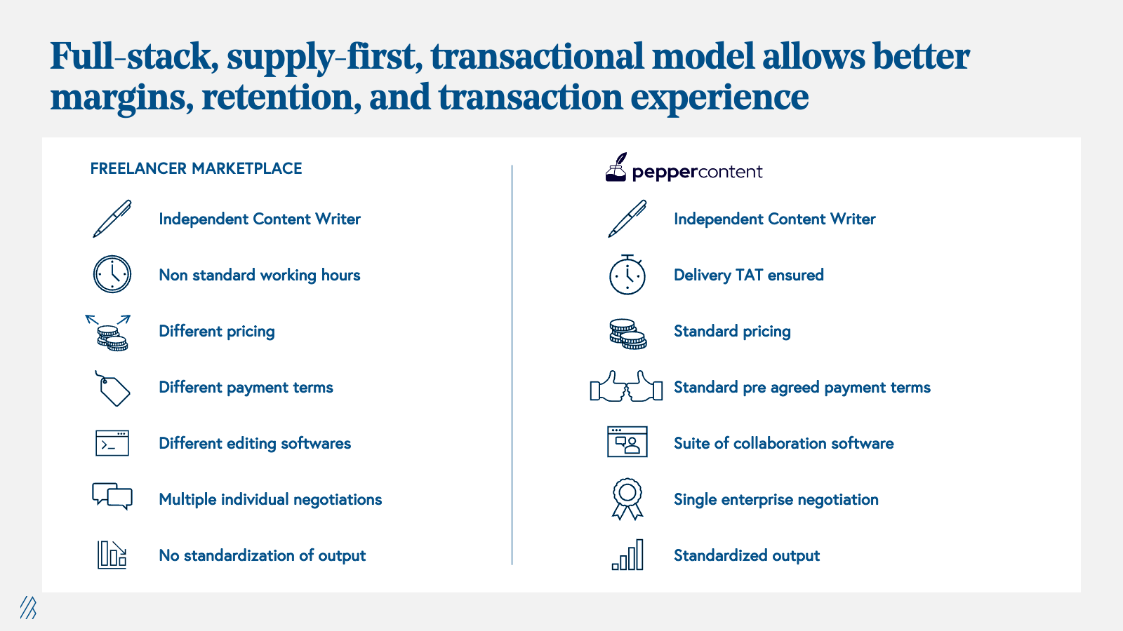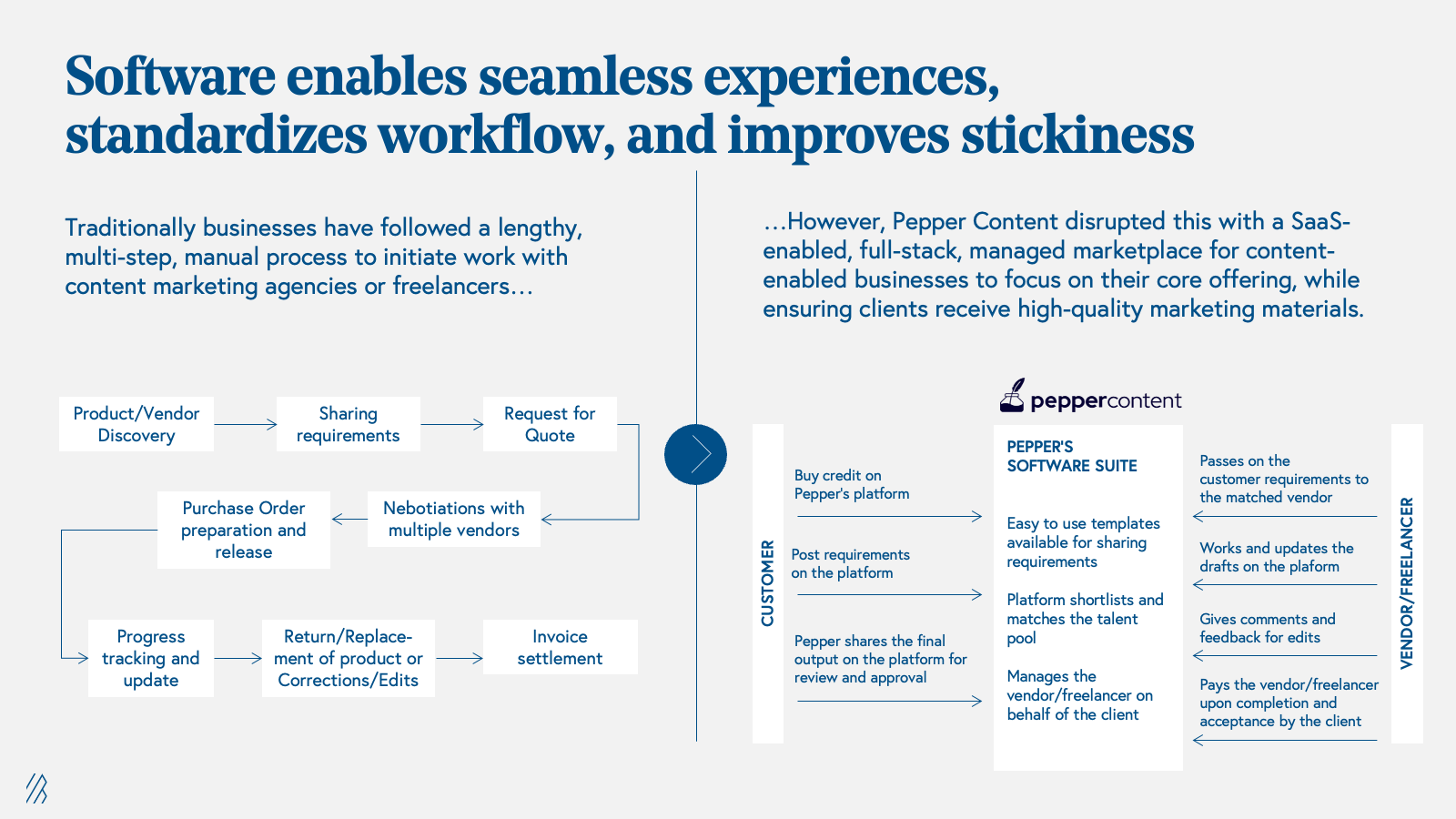 Leveraging generative AI: Our portfolio company Pepper Content, a SaaS-enabled full-stack managed B2B services marketplace for content marketing, exemplifies this. Pepper Content connects businesses with a network of freelance writers, editors, and designers, who can create high-quality content for a wide range of industries. The platform uses software to automate many of the processes involved in connecting businesses with content creators, including project management, payment, and delivery. This helps businesses save time and money on content creation, as they can find high-quality writers and designers at a standardized cost without the hassles of negotiating with individual freelancers, hiring full-time employees, or finding freelancers every time the organization has new content needs. For freelancers, Pepper Content provides them with consistent business and gives them visibility into their earning while also providing them with AI-driven tools to help ease their work. This increase in efficiency and cost-effectiveness on both sides of the marketplace is the main reason why software enabled B2B marketplaces like Pepper Content will thrive in today's market.