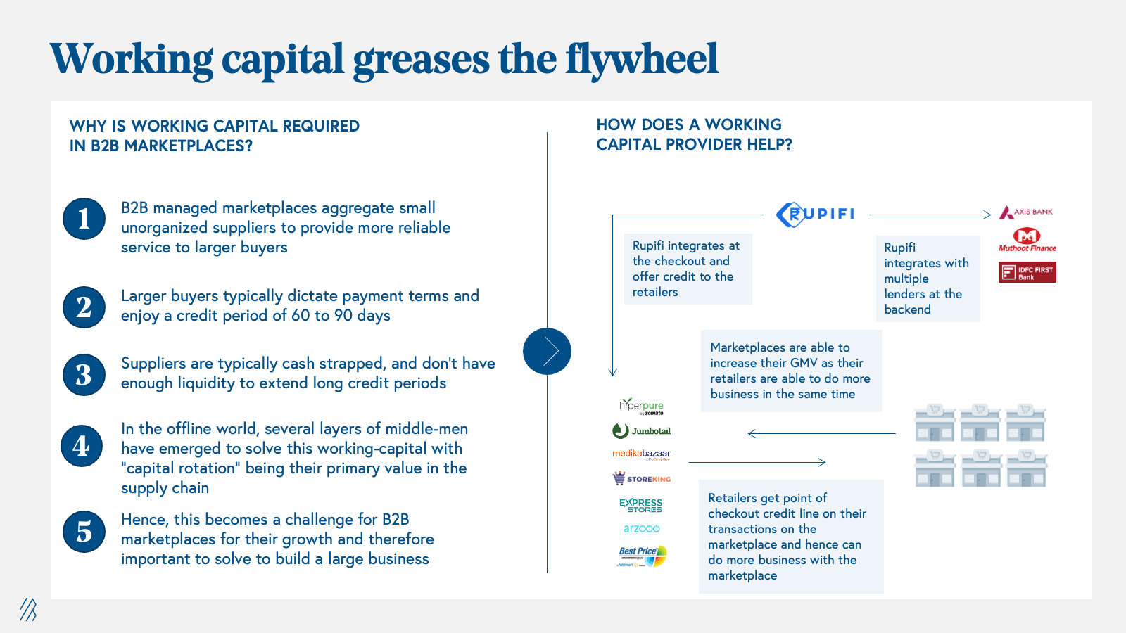 5. Working capital greases the fly-wheel – B2B businesses often require working capital, typically with credit periods ranging from 30 to 90 days. To achieve scalability, it is crucial for B2B marketplaces to address this financing need. However, when marketplaces lend from their own balance sheets, they assume credit risk, which can erode their margins, given historical default rates for MSMEs of 8-10%. Moreover, scaling the loan book becomes capital-intensive, making balance sheet lending an unfavorable solution.