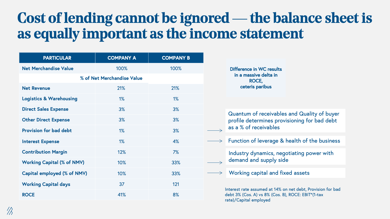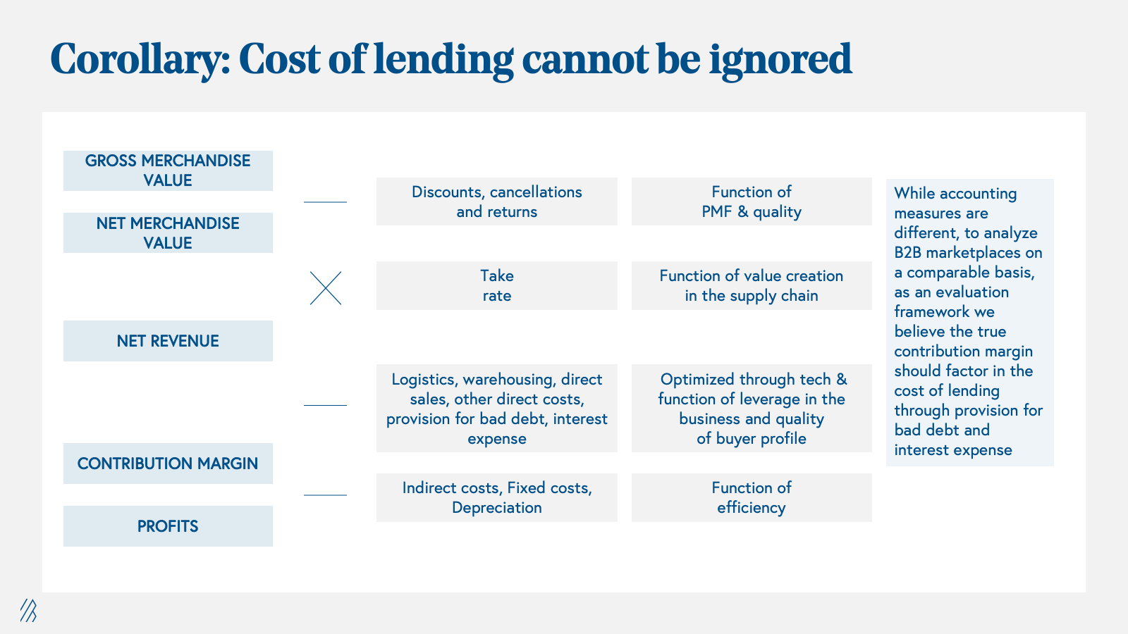 But the cost of lending cannot be ignored: While working capital enablement is an important part of any B2B business, the costs of lending cannot be ignored. Analyzing the costs associated with working capital is crucial in the context of B2B businesses. The working capital needs vary depending on factors such as the operating model of the marketplace, the market dynamics of the particular vertical, and the wallet share between suppliers and buyers. It's worth noting that as the B2B marketplace scales and gains more negotiating power with suppliers, the dynamics of working capital can change. Whether the working capital is sourced from equity, on-balance sheet debt, factoring, or through partnering with a B2B BNPL (Buy Now Pay Later) player, the costs involved manifest as bad debt, interest expenses, and/or potential compression of take rates on the P&L of the B2B marketplace. The illustration above demonstrates how these costs can significantly impact the true contribution margin of the business and must be carefully considered.