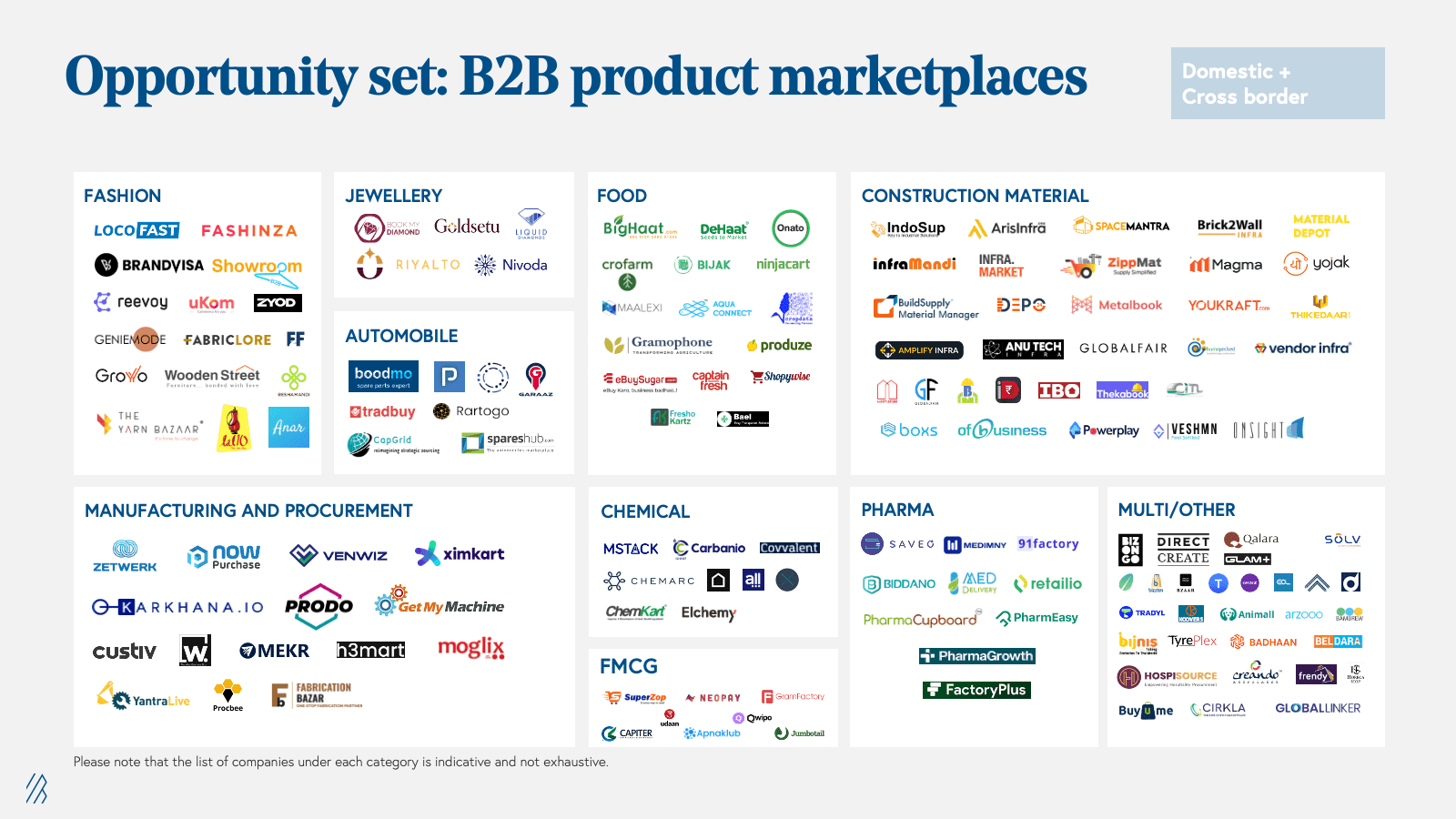 1. B2B product marketplaces: These are full-stack online marketplaces that not only connect buyers and sellers of physical goods, but also manage the entire transaction by providing relevant services, such as assortment, quality assurance, and logistics. They are often vertical-specific in sectors such as construction material, agriculture, chemicals, fashion, consumer electronics, jewelry, among others, and can be domestic and/or export-oriented.