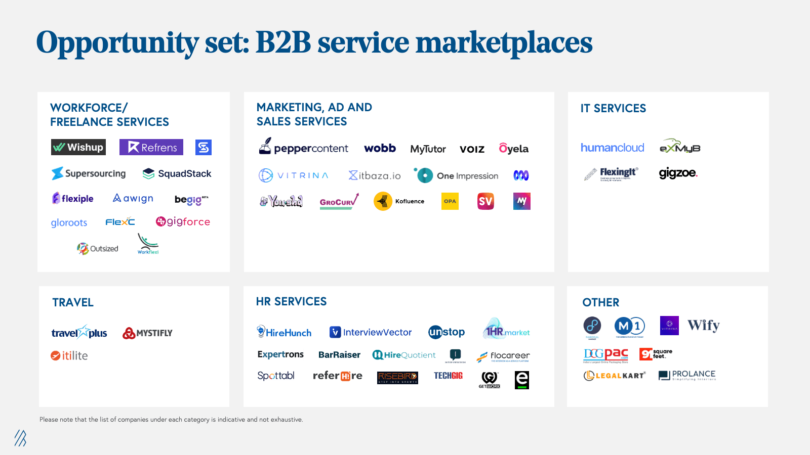 2. B2B services marketplaces: These are full-stack online marketplaces (like product marketplaces), but instead of physical products, they connect businesses with service providers such as freelancers, consultants, and agencies, and operate in verticals like marketing and sales, IT, recruitment and HR, industrial, among others.