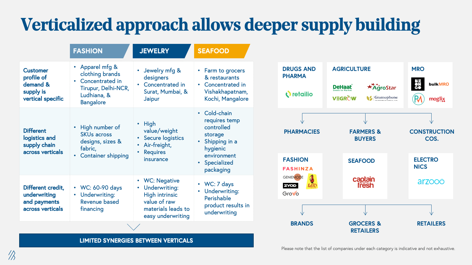 In the B2B supply chain, factors like buyer and supplier personas, working capital requirements, logistics, payments, and underwriting vary significantly across verticals. These disparities are better solved by the power of vertical marketplaces. Due to the distinctive nature of each industry's supply chain, there are limited synergies between verticals. Therefore, B2B marketplaces thrive by specializing in a specific vertical rather than attempting to cater to a wide range of industries. After establishing a strong presence and capturing a significant market share within a vertical, marketplaces can subsequently explore adjacent verticals or expand their reach within the existing vertical's supply chain. For instance, a B2B marketplace operating in the manufacturing sector can expand its services by venturing into distribution for buyers or engaging in raw material sourcing for suppliers, thus extending its value chain coverage.