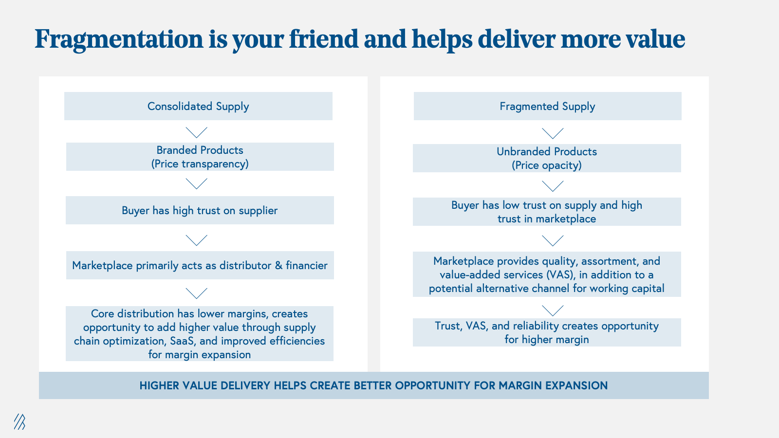 2. Fragmentation helps create and deliver more value: B2B Marketplaces thrive in fragmented industries. When the supply side of an industry is dominated by a few players, retailers already have knowledge of these players, trust their brands or reputation, and face no challenges in price discovery. In such cases, retailers can directly purchase from their preferred suppliers instead of relying on a B2B marketplace. Traditional middlemen often serve as distributors and financiers in these consolidated markets. To create a profitable business in this scenario, a B2B marketplace must deliver value through improved efficiencies, such as faster turnaround times, higher service levels, or a SaaS offering.