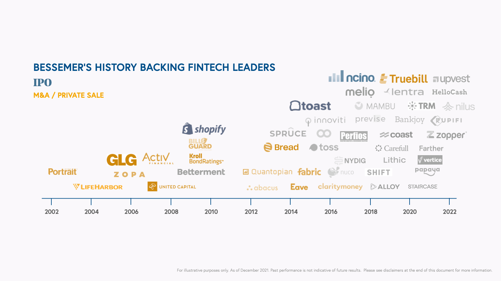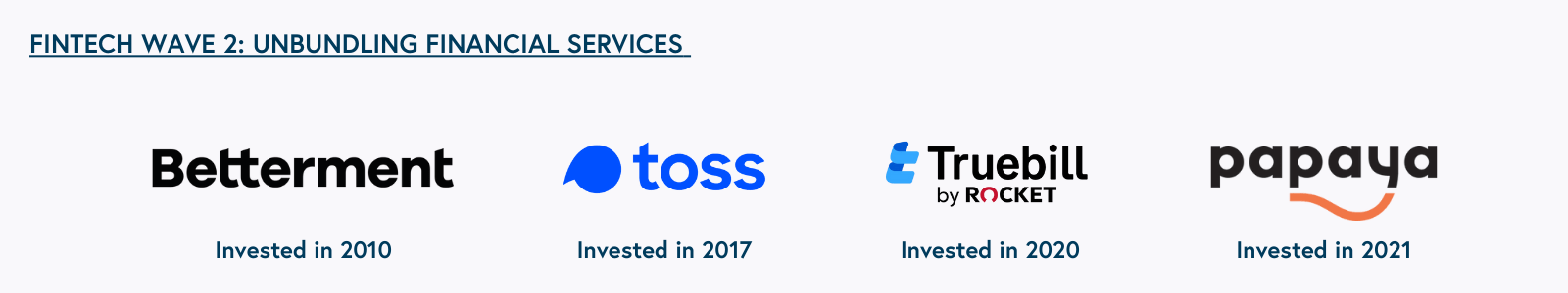 The unbundling of wealth management, a once gated financial service, was driven by the belief that wealth management should reach a broader audience with a straight-forward, affordable, and more accessible product. In 2010, we invested in Betterment. Its seamless and more accessible onboarding flow paired customers with low-cost ETFs and a portfolio of U.S. treasuries, according to their risk tolerance. At the time, web-based platforms for retail investors catered to sophisticated investors with complex products.