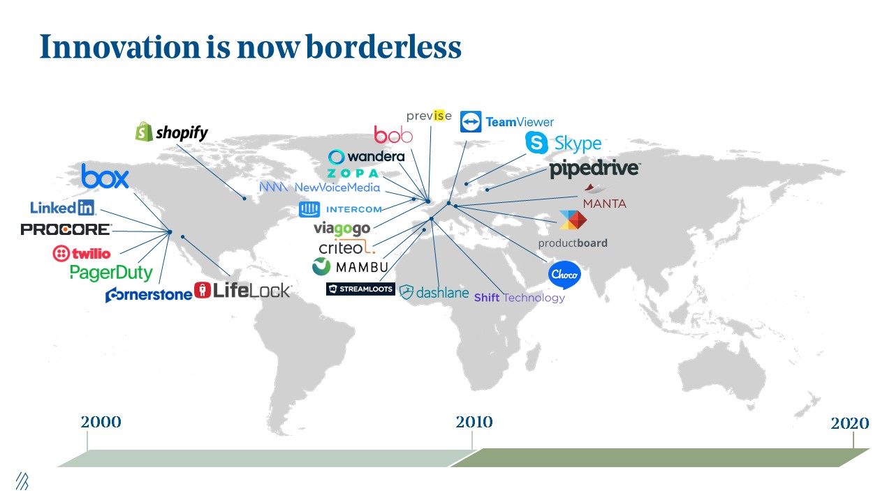 During the early days of the cloud from 2000 to 2010, most of our investments at Bessemer were in U.S. companies, but gradually we’ve begun to see a number of exciting opportunities emerge in global markets. As investors, we go where the founders are building great companies, whether in SF, London, or Estonia. Especially in the age of COVID-19, the location of where you may be on the map is less relevant than it might’ve been a few months ago. We've found that remote-first and distributed teams across Europe are more operationally efficient, have a leg up in terms of tapping into top technical talent, and are more diverse.