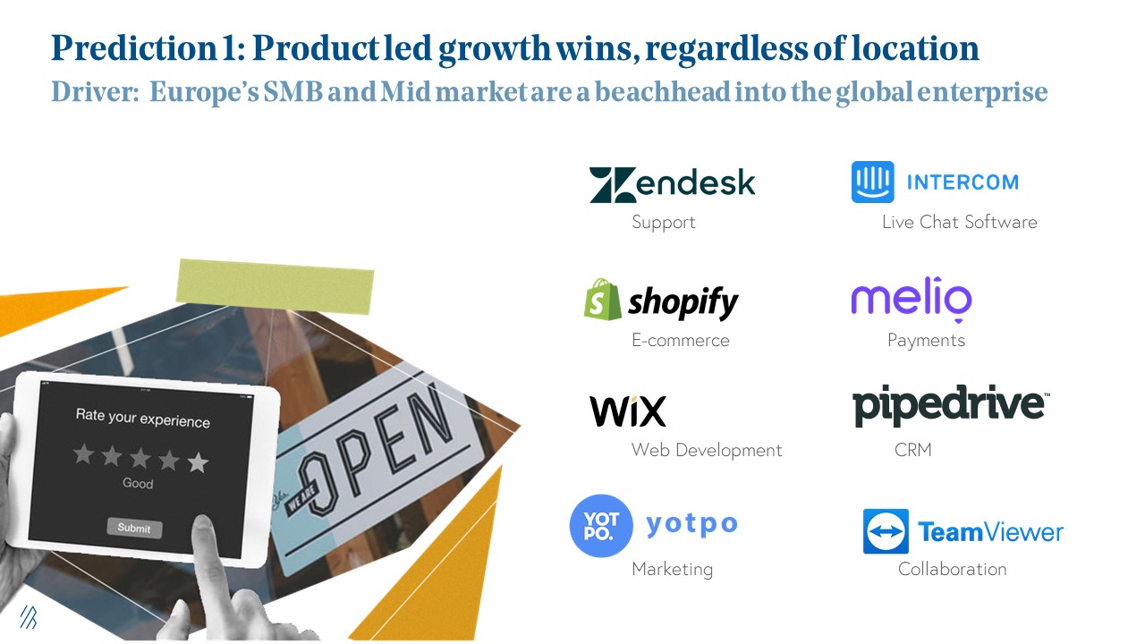 At Bessemer, we've seen this trend play out in companies like Shopify in Canada and Wix in Israel, but have seen the trend translate towards companies like Pipedrive and Intercom as well. These are all examples of companies that have served and positioned themselves as leaders in large categories of software using a product led growth strategy that did not require them to build expensive field sales teams or large offices in the U.S. Lastly, we expect that most if not all of the categories of enterprise software will have SMB counterparts.