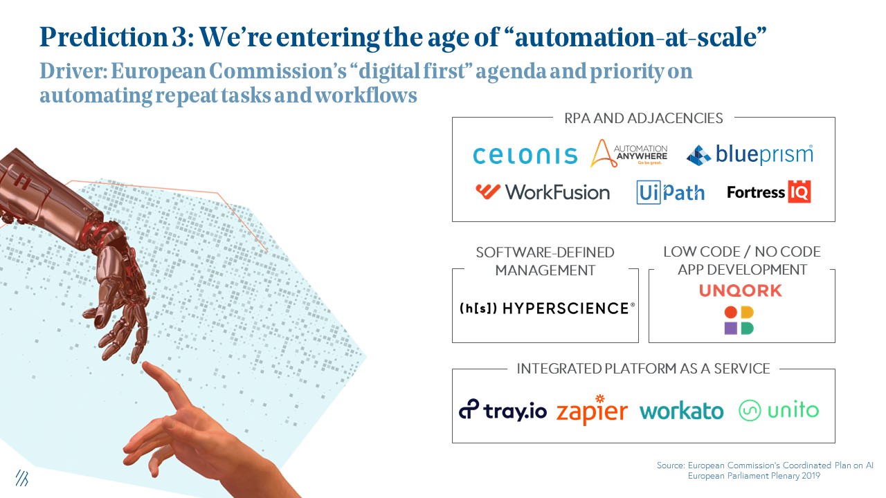 Another is Software-Defined Management, championed by the company HyperScience, which automates entire business processes via application building blocks in order to increase labor efficiency and to trigger enhanced human-machine collaboration. Interestingly, we've seen strong vendors coming out of Europe, such as Celonis in the process mining category from Germany, as well as UiPath, from Romania and BluePrism, from the UK. We're candidly not quite sure exactly why Europe has taken the lead on developing these automation companies over places like the US, but between these companies we think Europe is already a leader in automation and welcome feedback from founders on this area.