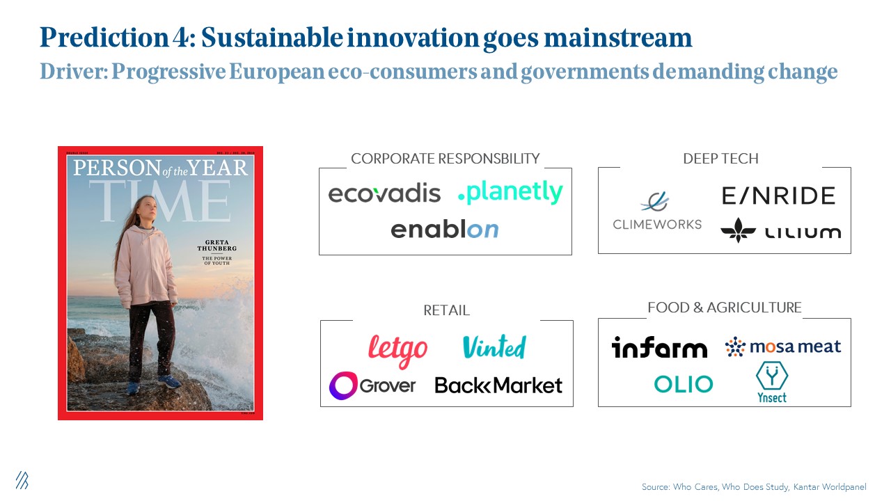 We think sustainability will be and already is a defining theme in Europe. As we saw with Greta Thunberg when she sailed from Sweden to the U.S. last year, a new class of "eco consumers" are demanding sustainable goods and services led by European companies such as Vinted in the second hand clothing space, or Mosa Meat, a pioneer in the clean meat industry.