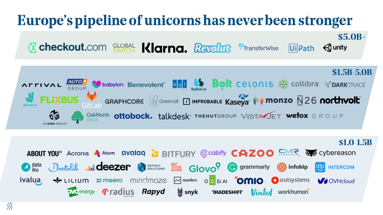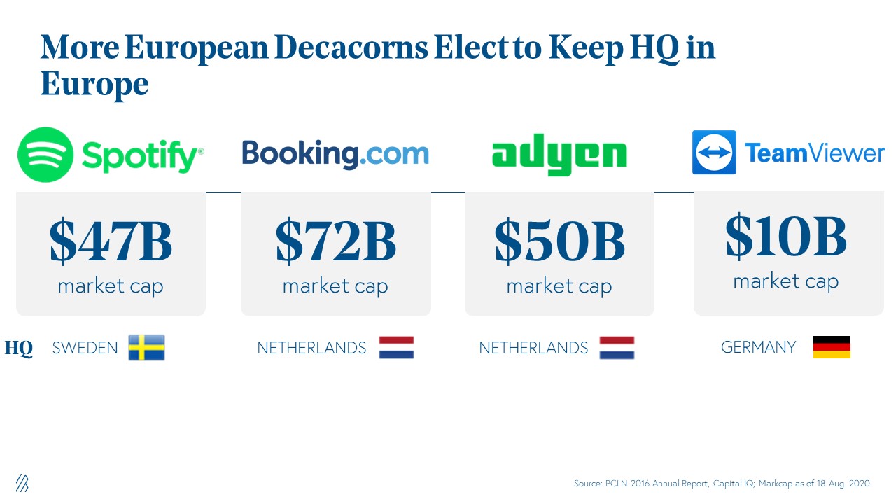 1. Lastly, we’ve begun to see not just unicorns but also decacorns rise throughout Europe. Some of the largest European successes are choosing to remain headquartered in Europe, including TeamViewer in Germany with a $10 billion market capitalization, Spotify in Sweden with a $47 billion market capitalization, Adyen in The Netherlands with a $50 billion market capitalization, and Booking.com also in The Netherlands with a $72 billion market capitalization.