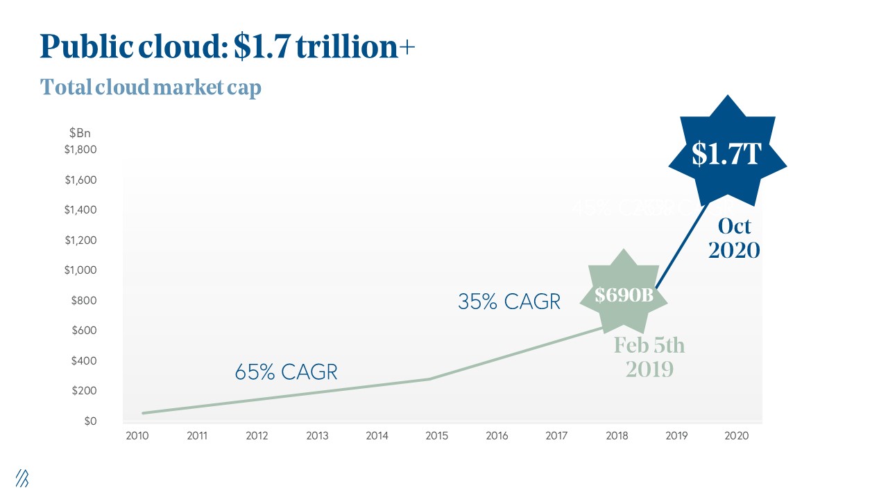 Just 10 years ago, the entire market capitalization of the global public cloud industry totaled just under $40 billion. Five years later, that scaled up 6x, but still totaled just a bit over $200 billion. At the start of the year, the public cloud market hit a milestone we’ve been waiting for — finally, on February 5, 2020, we surpassed the $1 trillion market capitalization, with a 45% growth rate.