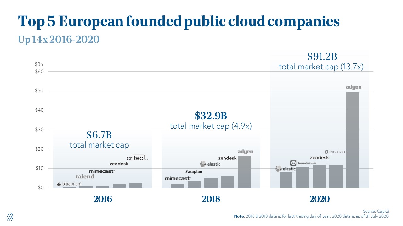In the past four years, we’ve seen meaningful growth among the top five European founded public cloud companies. Starting in just 2016, the collective market cap of companies like Zendesk and Criteo were in the early days, just under $7 billion. Two years later, we saw a 5x increase in market cap to $32 billion, driven by exciting players like Adyen and Elastic. Finally, moving to just two years later, as of Summer 2020, the top five European founded cloud companies have created over $91 billion in market cap. This is another 13x growth from just 2 years prior. In totality, this represents a 14x over this 4 year period. In addition to a growing public cloud, European private cloud companies show promise as well.