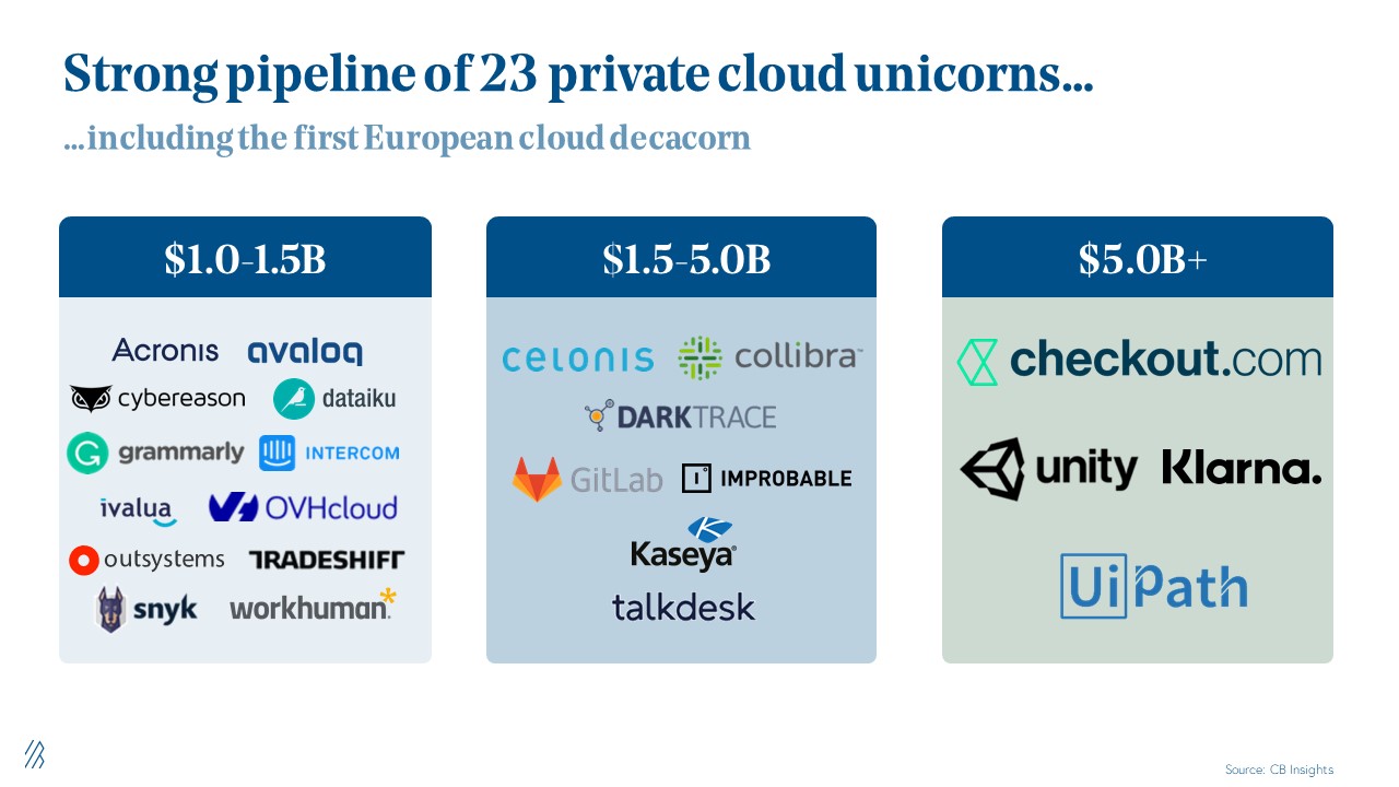 Europe is poised for more cloud success, with more than 23 private cloud unicorns founded in Europe today and even more exciting the first cloud decacorn with UiPath, and more recently Unity going public.