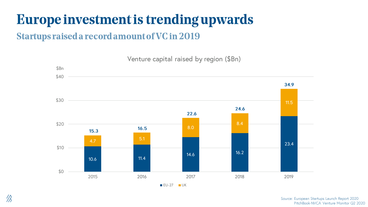 1. Venture capital investment is steadily rising across the continent. In 2019 alone, startups raised a total of $34.9 billion in venture dollars across the UK and the European Union. The total capital raised has more than doubled in the past four years. We expect this trend to continue, as emerging technology companies such as UiPath, Productboard, Intercom, Shift Technology, and Pipedrive have been founded across European tech hotspots in the past several years.