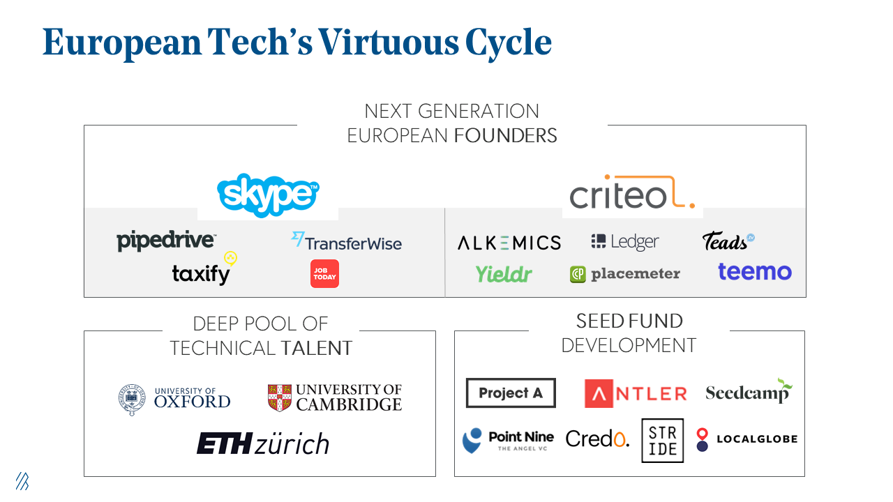 First, we’re emerging out of the first wave of successful European tech companies, such as Skype, Criteo, Spotify, and Adyen. Success stories like these are what inspire a new entrepreneurial base within a region. Secondly, Europe has a deep pool of technical talent even more so than the United States, making it a stronghold for software innovation. And finally, in the venture community there’s a new wellspring of seed funds helping capitalize the ecosystem and finance these emerging breakout companies across Europe.