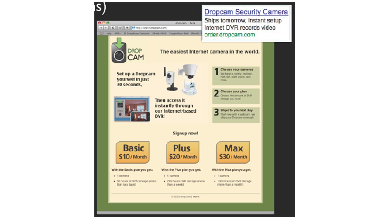 Dropcam did a limited test of acquiring users through Google AdWords. Over a 3-day period, they bought several keywords related to wireless cameras and saw a 20% sign up rate. Admittedly, they merely asked each user for their name and email address – rather than taking them through the full ordering process including inputting payment information. However, they were pleased with this level of conversion and believe with additional optimization they can get to a user acquisition cost of less than $30.