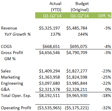 The company ended the first half of 2014 3% behind plan on the topline but way underspent (18%) and so had an operating loss of $3.5m vs. a plan of $5.2m: