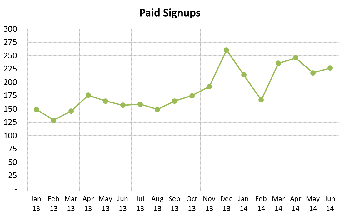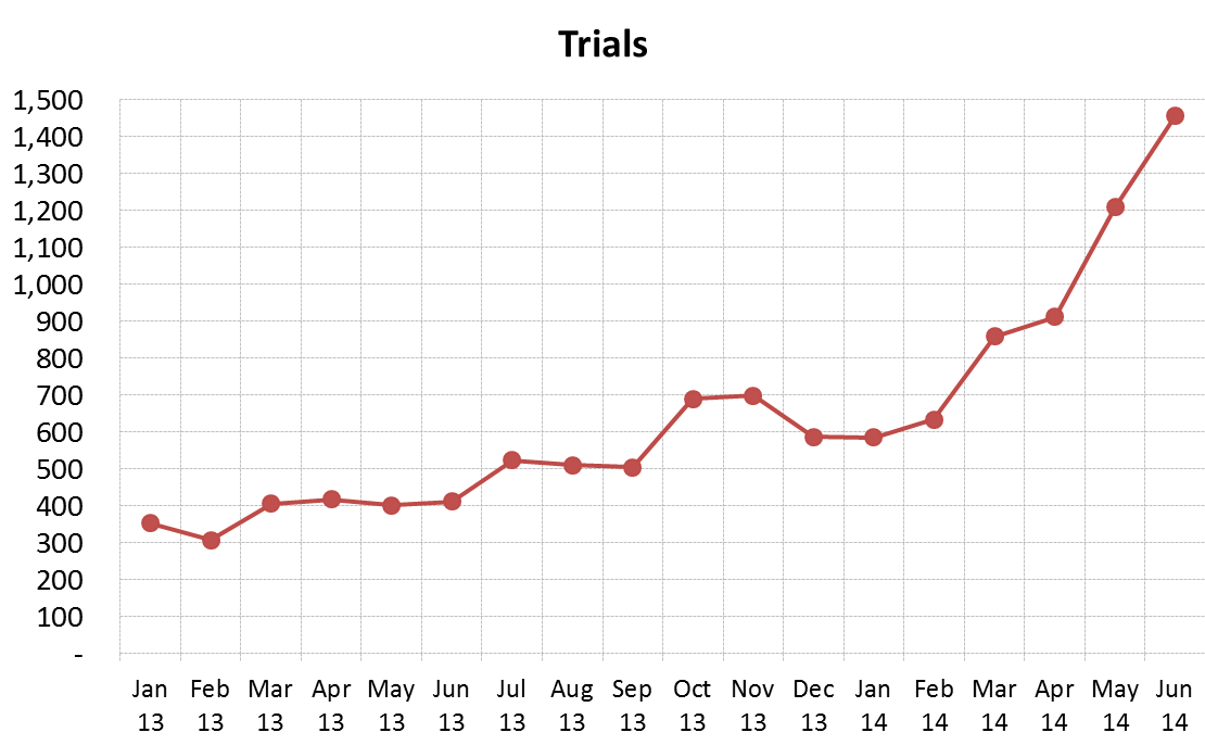 The fully-loaded CAC payback on new initial MRR has averaged roughly 19 months over the last six months, although it’s spiked as they’ve ramped marketing spend on lead volume ahead of the rate of hiring new sales reps. Once signed up, accounts expand consistently. By month twelve, initial MRR across customer cohorts has grown by 75%. And by month 24, revenue has grown by 260% (see APPENDIX). Based on our analysis, the effect of this is that the CAC payback for the April’14 customer cohort is more like 9-10 months.