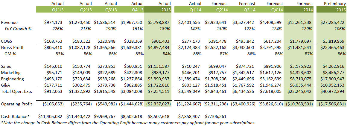 The preliminary plan for 2015 is to do $27mm in revenue with an aggressive ramp in expenses, particularly around engineering. Admittedly, there isn’t much precision around the 2015 plan since the new CFO has only been in place for about 2 months. There may be additional upside on the topline if marketing continues to perform well at demand generation but it’s too early to say for sure.