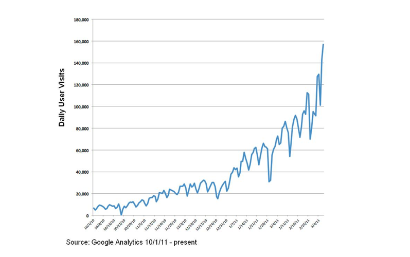 Sarah first met the company in late 2009. At the time, Pinterest’s two founders were pursuing a strategy to build product catalog iPhone applications called “Totes” for high-end brands. They launched a limited alpha of the product to some friends and quickly noticed that users were heavily using a small social sharing feature included in the product catalogs. When they asked the users what they liked about the feature, they learned that there wasn’t a good way for users to share and curate lists of products elsewhere. They put Tote, their original product, on hold and built Pinterest to take advantage of this insight, and they launched it in Q2 2010. Despite being accessible only through a closed beta, the site’s traction has accelerated in the last few months and in February registered 1m unique visitors and 20m page views. The majority of Pinterest’s traffic comes from social channels like Twitter, Facebook and Tumblr, and almost all of the 30% that comes from Google is based on search queries that include the Pinterest brand name.