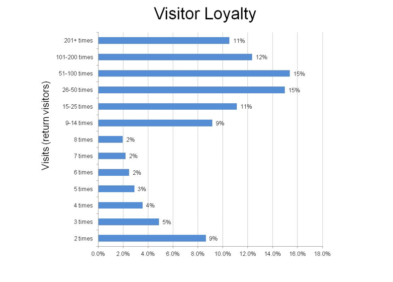 As previously mentioned, this growth has come with no spend in marketing. In fact, the founders have held back the community’s growth with a limited beta in order to ensure they create a core community on the site before they open the registration process. The efforts seem to be working. Thus far, 74% of Pinterest’s visitors return to the site, and of those that return, visitor loyalty has been extremely impressive: