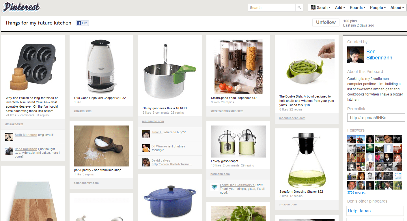 The site lets users in the community “pin” products from around the web either by copying URLs or using a browser bookmark in a fashion pioneered by Del.icio.us several years ago. Shortly, consumers will be able to use an iPhone app as well. Once “pinned,” products are then curated on “pin boards.” Pin boards tend to be themed. For example, Ben Silbermann, one of Pinterest’s two co-founders, created a board called “Things for my future kitchen” (http://pinterest.com/ben/things-for-my-future-kitchen), a curated catalog of different kitchen products Ben has found around the web:
