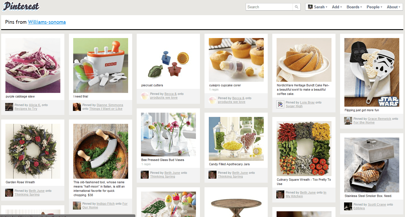 If you click on a product, you’re taken to a product page that aggregates all comments, “likes”, or “repins” (similar to “retweets” on Twitter) that other people in the community have made on that product. Similar to the company’s original social sharing functionality, the site also lets users share a product or pin board via Twitter, Facebook, email or with some embeddable javascript. Pinterest has acquired the majority of its traffic thus far from people using this functionality (check out http://twitter.com/#!/search/pinterest to see how people are sharing Pinterest on Twitter). The product page also has a link to the retailer from which the product was originally “pinned,” so if a user wants to learn more about the product or buy it, he simply needs to click on the product picture to be directed to the relevant page on a merchant’s site. There is also a side bar which features other products from the same merchant which have also been pinned by the Pinterest community. For example, this is the William Sonoma board (http://pinterest.com/source/williams-sonoma.com):