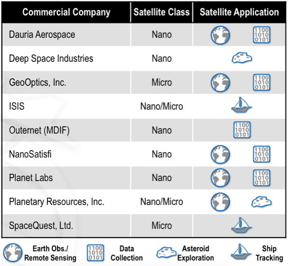 As a result, there is a major shortage of launch options for small and medium-sized payloads. We’ve spoken to several of Rocket Lab’s early customers, and they have verified this. Space Flight Services, the leading secondary payload aggregator that brokers deals and integrates payloads on to launch providers, brokered 87 payloads in September which were all between 5kg and 50kg. Close to half of these are from smaller upstarts (such as Planet Labs) so that demand is growing but may be less certain in the long term. They also see sub 100kg demand coming from universities and the government sector because there is a shortage of launch supply. Below is a snapshot of emerging satellite companies that market research firm Spaceworks has seen as of 2013: