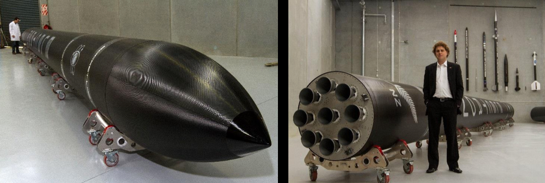 Another innovation is the heavy use of 3D printing for the creation of most of the Electron’s engines. This is very sophisticated laser-based 3D-printing, unlike the plastics-based 3d printing you may have seen from MakerBot and others. 3D printing is not only a cost savings, but it means Never Having to Say You’re Sorry, You’re Waiting For a Part. The engine is shown in the above photo and includes the 3D-printed thrust chamber, injector, and elements of the turbo pumps. Rocket Lab has provisional patents on the 3d-printed thrust chamber, injector, and electric turbo pumps. Electron will also feature all carbon-composite tanks which are 40% lighter than aluminum.