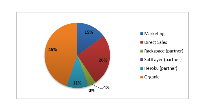 SendGrid has developed partnerships with several players in the hosting (Rackspace, Softlayer) and platform-as-a-service (Heroku) ecosystem who contribute 10k+ free accounts but very few paid accounts. However, these partnerships could expand considerably and there have even been real discussions where SendGrid would, in the near-term, be the default transactional e-mail service provider for every Rackspace customer. Monthly, Heroku contributes $8.4k MRR (30% revenue share to Heroku), Rackspace contributes $2.9k MRR (no revenue share to Rackspace) and Softlayer contributes only $0.15k MRR (70% revenue share to Softlayer who handles all support requirements). They are also pursuing a formalized relationship with Amazon where they would be the default upgrade from Amazon’s lite SES service, though they are walking a fine line between competition and cooperation there.