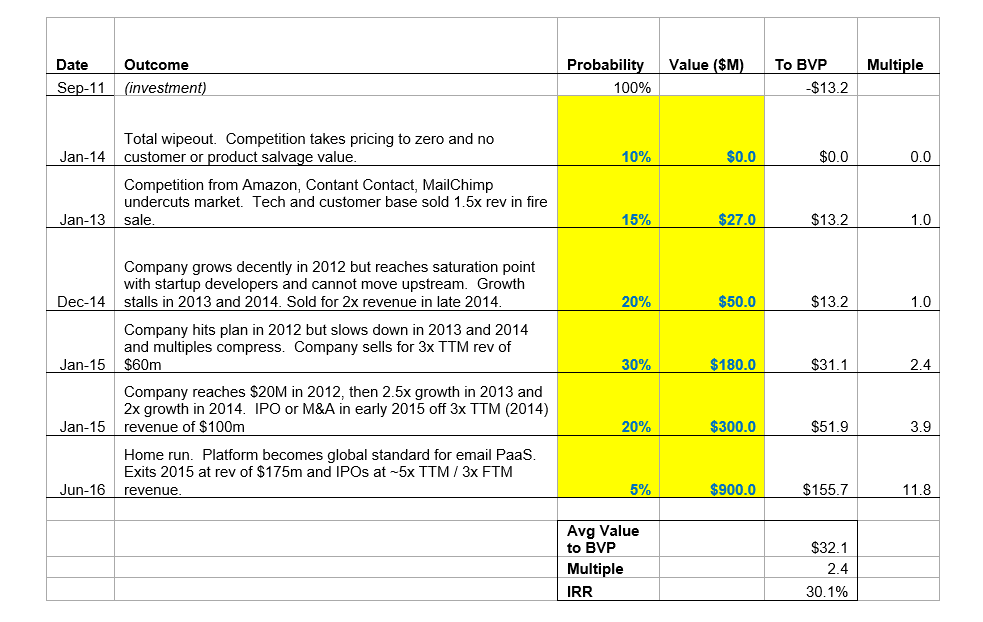 We recommend a $13.2mm investment in the $21.2mm BVP-led Series B financing of SendGrid. SendGrid is an e-mail Platform-as-a-Service (PaaS) company that presented to the partnership from Menlo Park several weeks ago. After receiving very positive feedback from the partnership, we gained the support of the SendGrid team and board to allow an outsider into the round. After a long back-and-forth process, we ultimately signed a term sheet with the company to lead a plain vanilla round at a $60mm pre-money valuation, including $4.9mm of founder liquidity (we will receive preference protection on the full amount). Including the effect of this share buyback, the resulting post-money valuation is $76.3mm, and BVP will own 17.3% of the company.