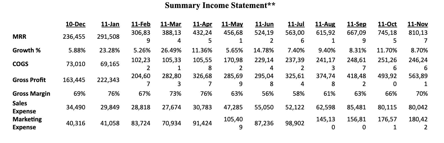 Sendgrid has ~60,000 “customers,” ~ 6,000 of which are paying, for an aggregate CMRR of ~$850k, and an annual subscription revenue run rate (ARR) of ~$10.2m. They are on track to hit their 2011 budget of $6.7mm in subscription revenue, up from 1.4mm in 2010, and project $17mm and $34mm in 2012 and 2013. Because customers pay up-front for an e-mail allowance and pay the overages at the end of the month, SendGrid has strong predictability on the first day of a month. November’s absolute floor, for instance, was $790k and the company ended with $810k due to ~$20k in overages. In 2011, the average MoM CMRR growth rate was and continues to be in the double digits: they grew 11.7% between September and October and 8.7% between October and November.