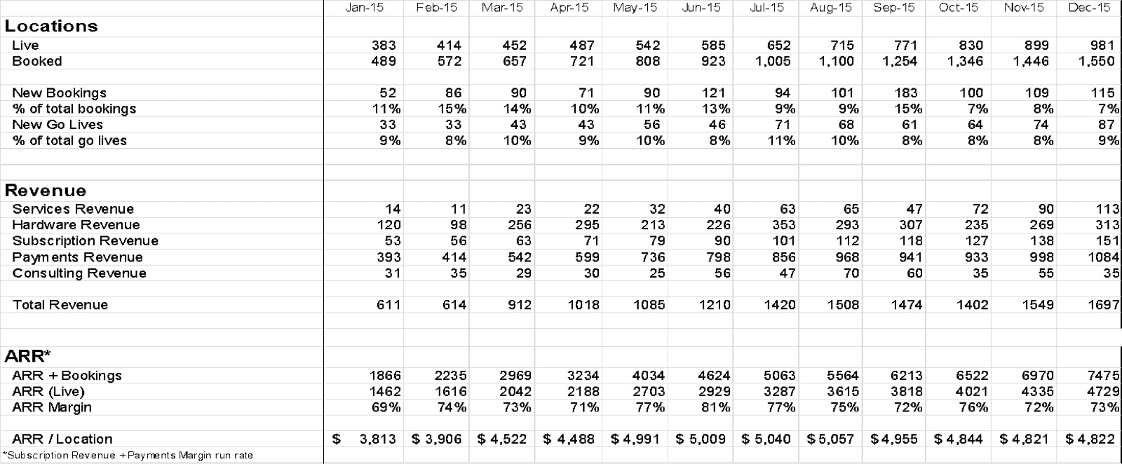 The way to think about the business is about a core recurring engine of high margin subscription software and payment processing, served by an implementation arm working to get these customers live. Today Toast makes a slight margin on hardware, breaks even on consulting (which ends up being a way for Toast to subsidize some product development) and loses money on implementation services which is a big area for improvement in 2016 with pricing and process upgrades.