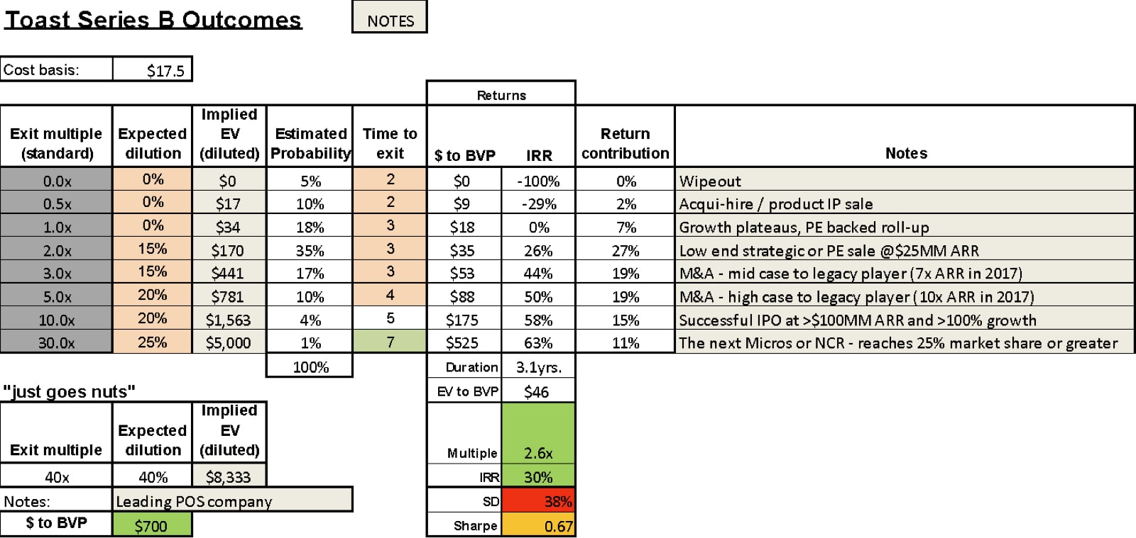 We recommend a $17.5M investment in the $24M first institutional round of Toast, a Boston based company selling restaurant point of sale (POS) software. Our $17.5M will purchase 14.3% FD ownership and will see a 2X return at a $150M exit and a 2.5X return at a $210M exit. Our hope, of course, is that Toast will use what we believe is a meaningful product advantage to grab a large share of the 1M restaurants who will transition to cloud based POS in the coming decade. The benefit of a massive market is that with a little more than 1% market penetration Toast could be a $100M revenue company. The company momentum since signing our term sheet has us eager to close ASAP and we hope that an impressive product, a huge market, and potential for continued capital efficient hyper-growth will make up for an admittedly premium price on entry.