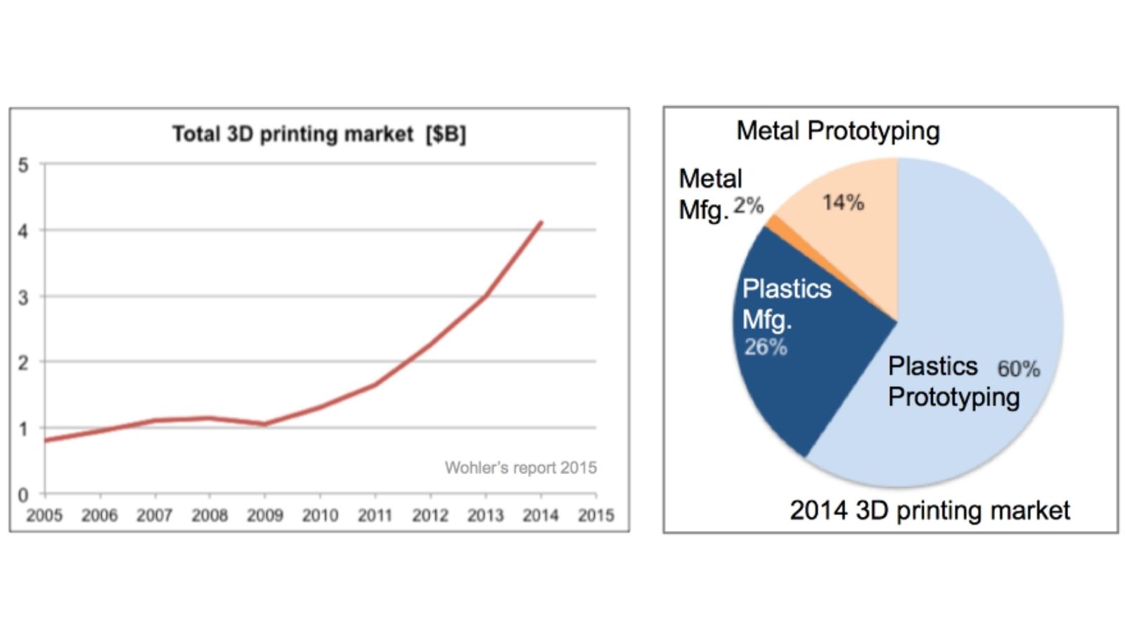 3D printing is a $4B market, with a 6-to-1 ratio of plastics-to-metal, and a 5-to-2 ratio of prototyping to manufacturing. The manufacturing segment is growing fast – now a third of the plastic printing market – but it still represents only an eighth of the metal printing market.