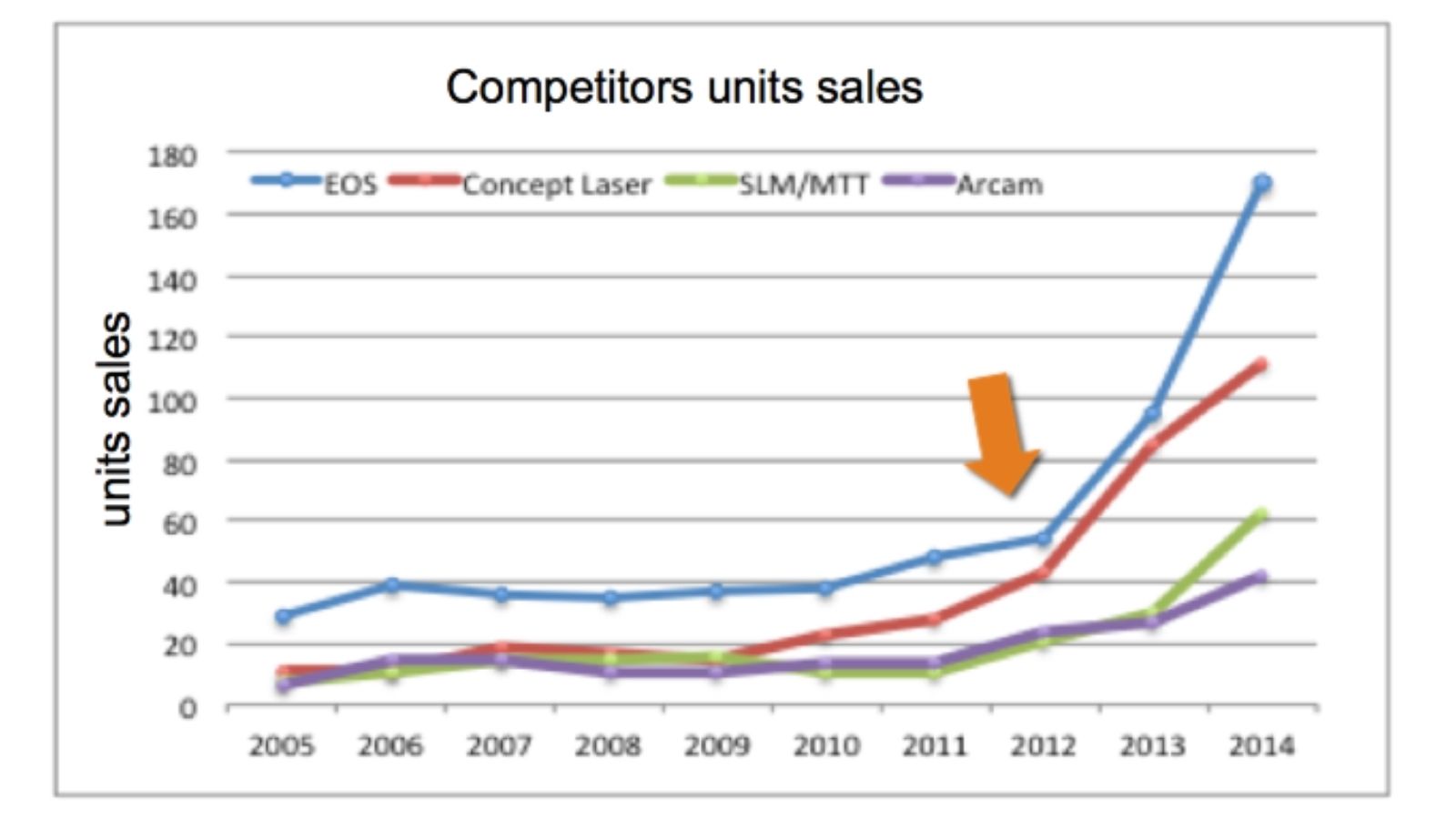 Last year, about 500 metal 3D printers were sold at an average of $700K each, totaling $350M of revenue. Growth has started to inflect in recent years as this market grew by over 60% in 2013 and again in 2014. This is in contrast to the overall additive manufacturing market which grew 25%. The primary industries purchasing metal 3D printers are Industrial machining, Aerospace, Dental/Medical, Academic, and Automotive. The market for metal 3D printers is dominated by 4 European companies: EOS Systems, Concept Laser, SLM, and Arcam.