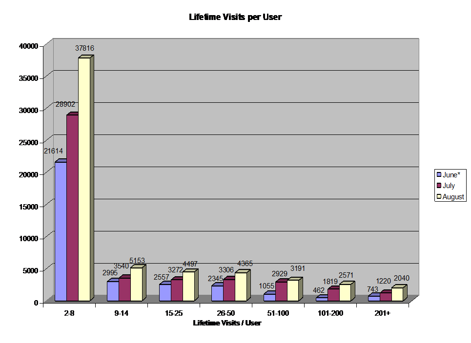 A chart of Yelp’s monthly visit count is below. The original service (pre April re-launch) required users to ask their friends about local attractions, and the growth did not accelerate until the current site went live in April. (Note that even with the little bit of marketing they recently initiated, the entire company cash burn is under $45k per month).