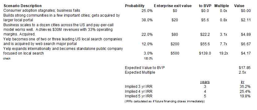 I wish this deal would be cheaper, but the Yelp founders anchored their expectations around the recent Sequoia investment in Insiderpages (Mike Moritz led an $8M Series B at ~$12M pre this past summer). Given the likely level of VC interest in Yelp and the fact that its product is better than the Insiderpages site, I believe a $13M pre-money price inclusive of a 20% post-money option pool represents an attractive set of terms. We will own 27.8% of the company for our $5M investment.