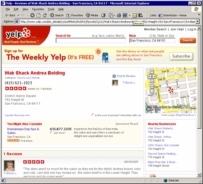Citysearch – Citysearch is the leader in local search products today. Most of its content is editorial (composed by employees as opposed to generated by consumers), though it has started to collect consumer reviews as well. Because historically it charged advertisers for listings, it is impossible to find a merchant rated lower than 7 out of 10 by Citysearch’s editorial staff (no poorly rated merchant wanted to advertise), and most merchants are 8 or higher. However, Citysearch is still the 250th most visited site on the web according to Alexa.