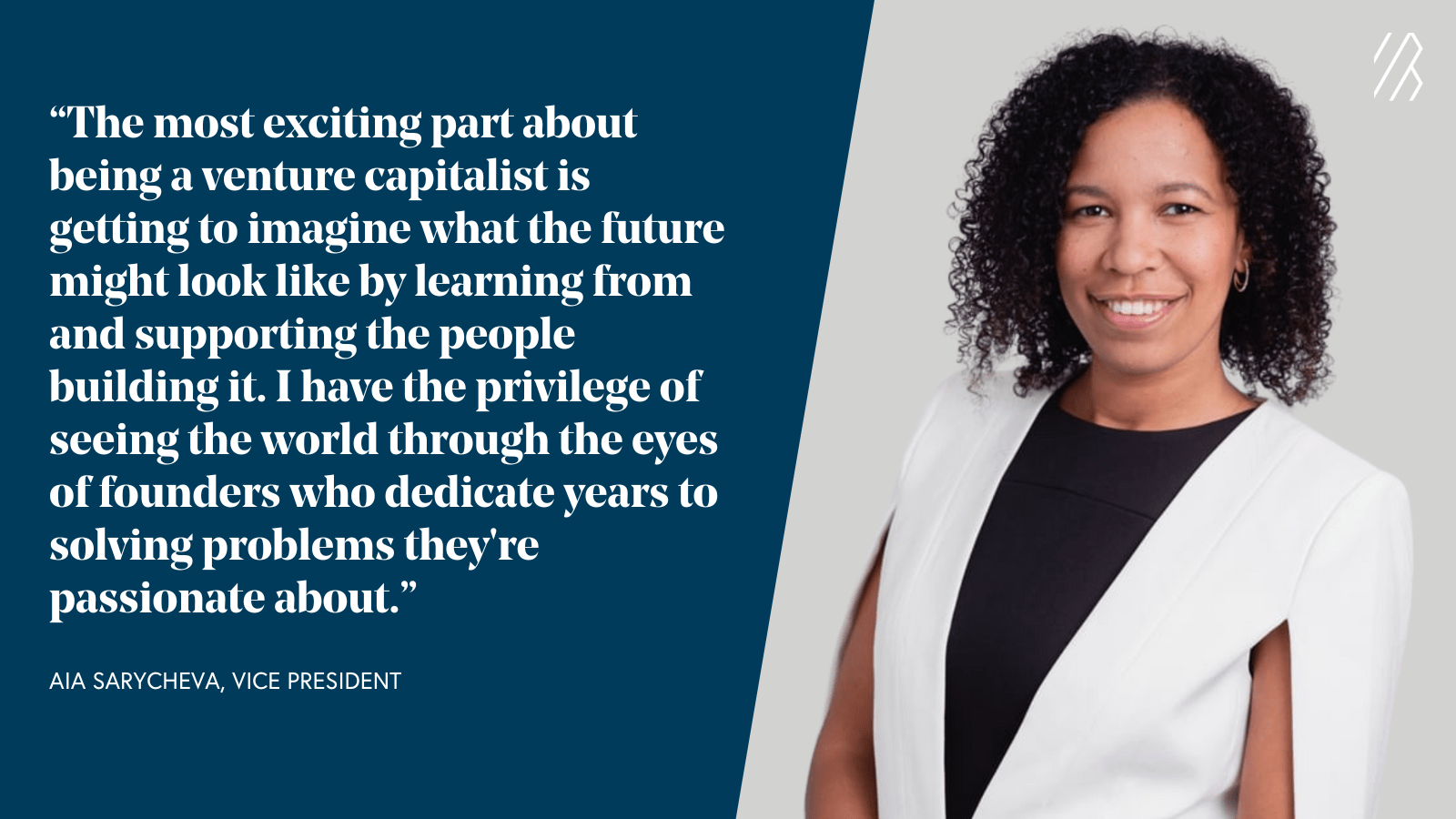 "The most exciting part about being a venture capitalist is getting to imagine what the future might look like by learning from and supporting the people building it," says Aia. "I have the privilege of seeing the world through the eyes of founders who dedicate years to solving problems they're passionate about. My role is to draw on lessons from recent technological breakthroughs, industry developments, and the paths of prior venture-backed companies to support them in building enduring businesses. This requires developing a view on when to learn from the past and when to break from it—an exciting, intellectually rigorous, and inherently synergistic process."
