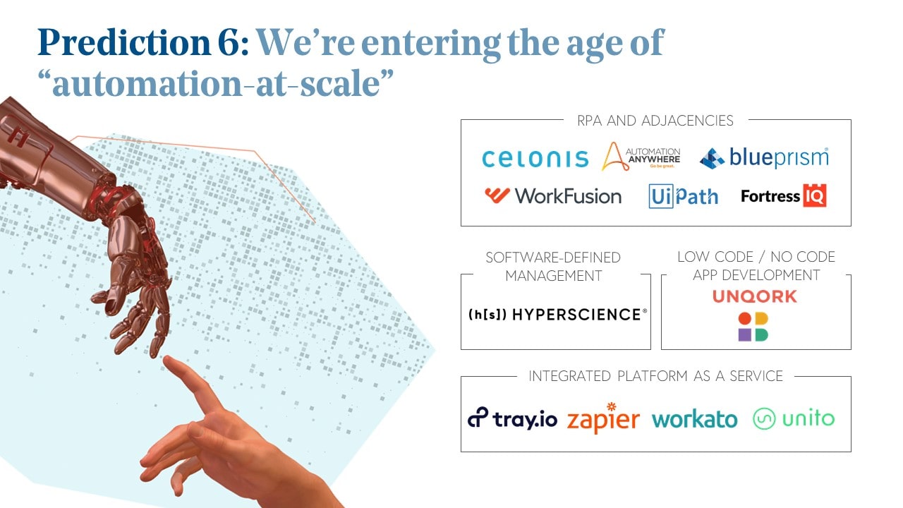 As we discussed in the State of the Cloud 2020, “automation at scale” is a recent trend in software that aims to solve for this human constraint, using software to help operationalize data. The automation of workflows, business processes, and even application development allows companies to reduce error rates and increase productivity. There are multiple approaches to automation at scale: One of the most well-known is Robotic Process Automation, in which software “bots” are programmed to complete low intelligence tasks. Integrated-Platform-as-a-Service companies like Zapier and Unito also encourage workflow automation by enabling data flows between discrete applications through pre-built integrations. Both RPA and IPaaS are categories of automation that have been around for years, however, they have become more prevalent as of late as businesses come to appreciate the power of automation.