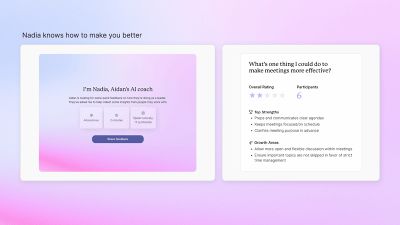 AI changes the game, making it possible to give every employee the sort of coaching only the C-suite used to receive. But AI coaching isn’t a replacement for human coaching — it’s a net new modality that expands who can access coaching and the consistency and effectiveness of coaching at scale. Nadia also has guardrails customized to each organization to escalate coaching to a human coach, manager, or HR in line with enterprise and organizational HR policies. For enterprises, AI enables the application of complex context, including operations, goals, and culture, to coaching for each individual.