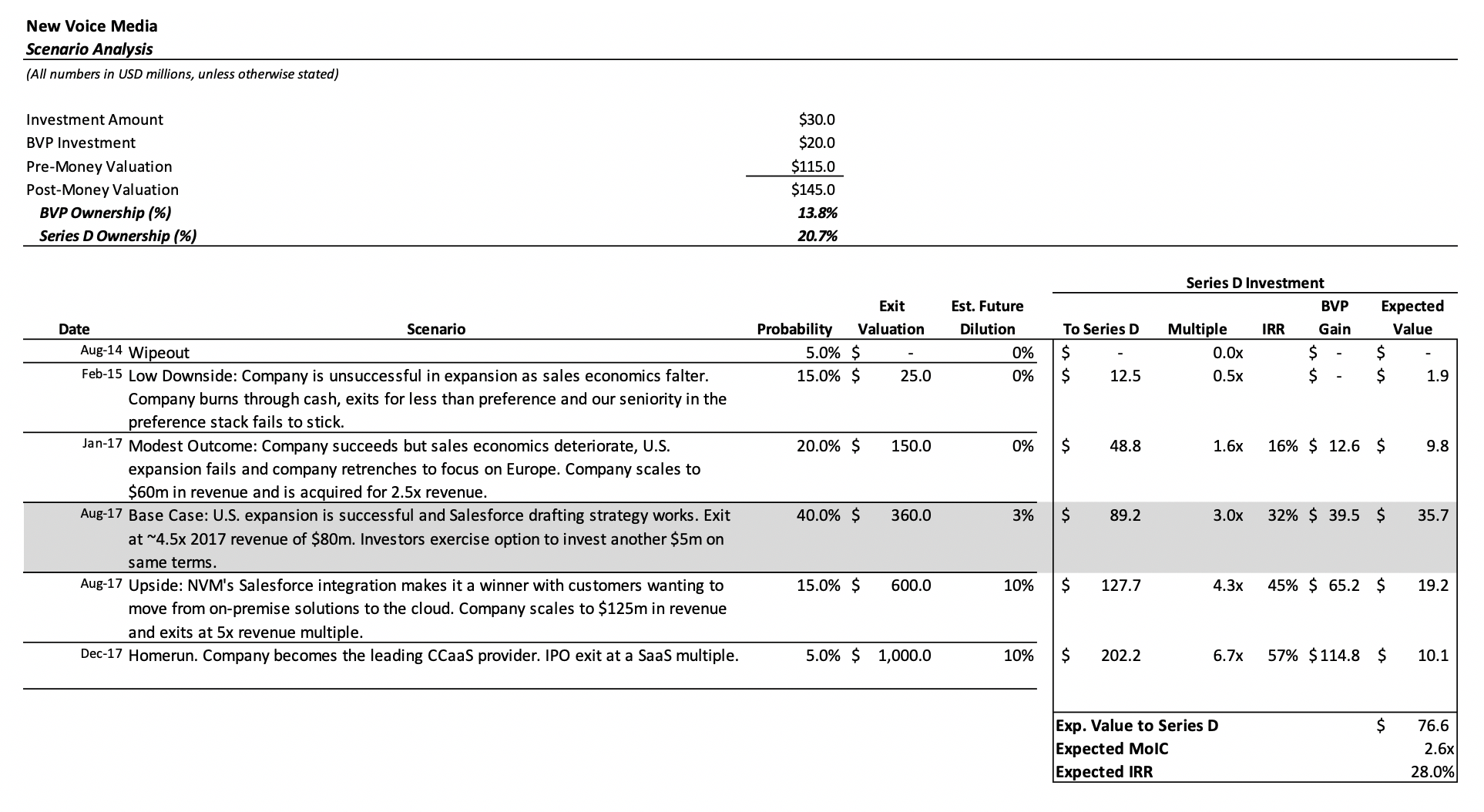 The first is that I vastly underestimated how much capital it would require to build a successful business in this category. An excellent way to illustrate this is by looking at the scenario analysis we put together around the time of our initial investment. We develop Scenario Analyses in an attempt to predict the various potential outcomes for the company as well as the expected additional dilution over time. The scenario analysis from our initial NewVoiceMedia investment recommendation is below.